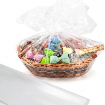 Tento celofán je vyroben z polypropylenu (PP) – jedná se o kvalitní průhlednou plastovou fólii určenou pro dekorativní balení. Nejde o původní celulózový (přírodní) celofán, ale o moderní plastový materiál, který je pevnější, odolnější a praktičtější pro balení dárkových košů.