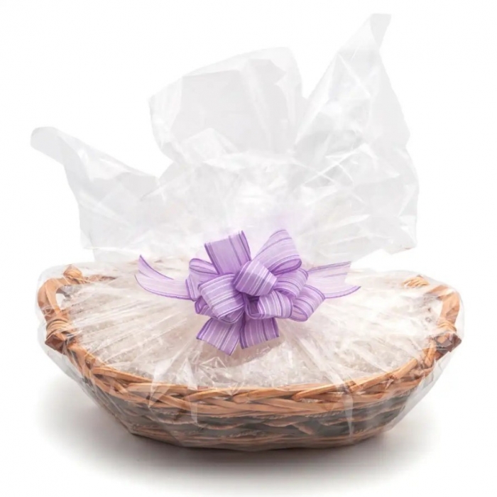 Tento celofán je vyroben z polypropylenu (PP) – jedná se o kvalitní průhlednou plastovou fólii určenou pro dekorativní balení. Nejde o původní celulózový (přírodní) celofán, ale o moderní plastový materiál, který je pevnější, odolnější a praktičtější pro balení dárkových košů.