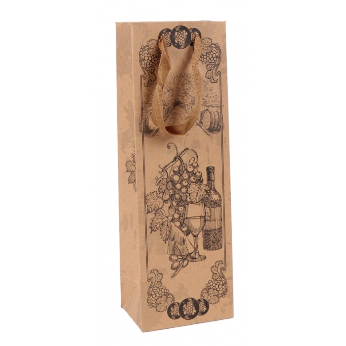 Materiál přírodní papír, pevné ploché textilní ouško. Taška je vhodná pro pro většinu lahví vín i šampaňského. Gramáž použitého papíru 190 gr.